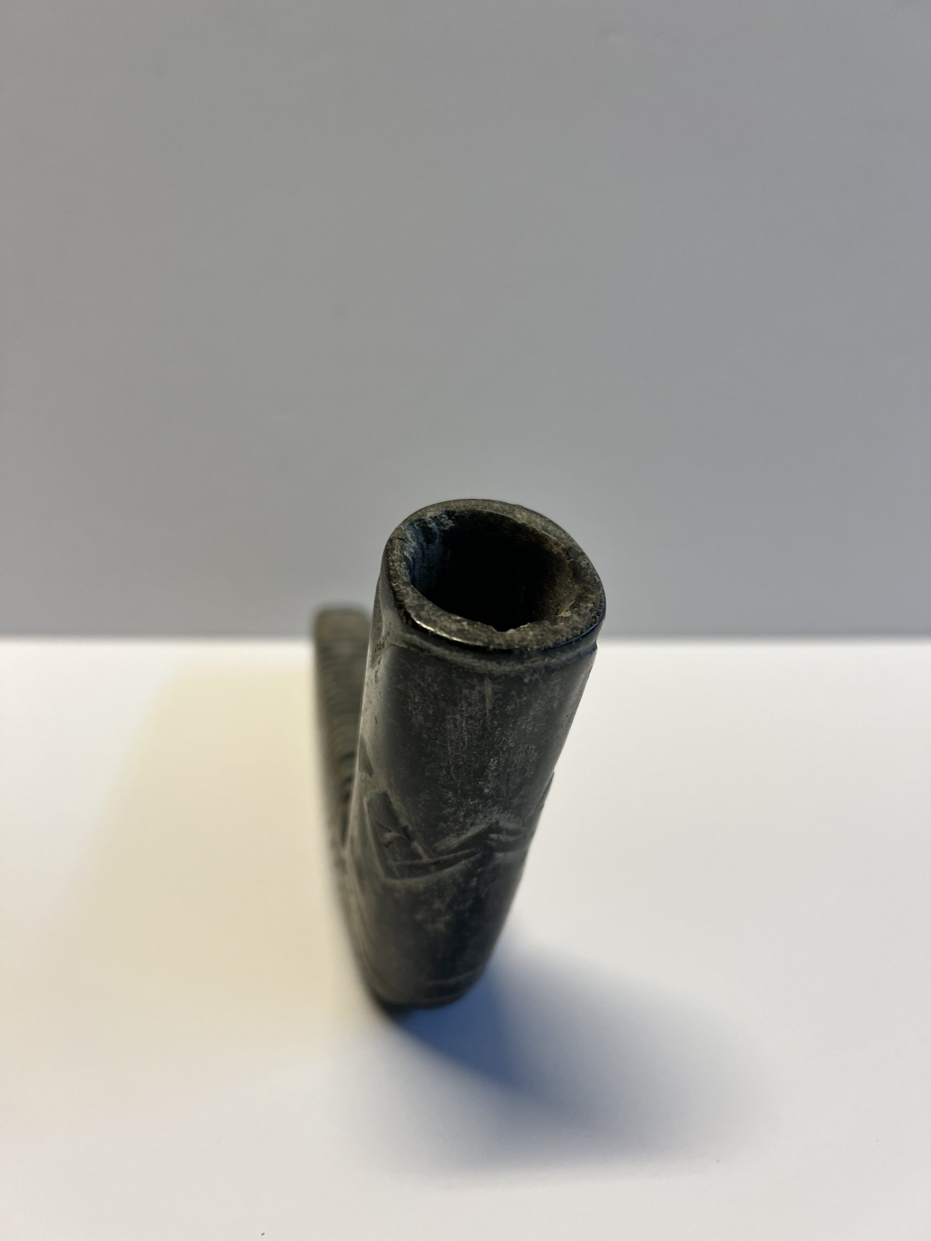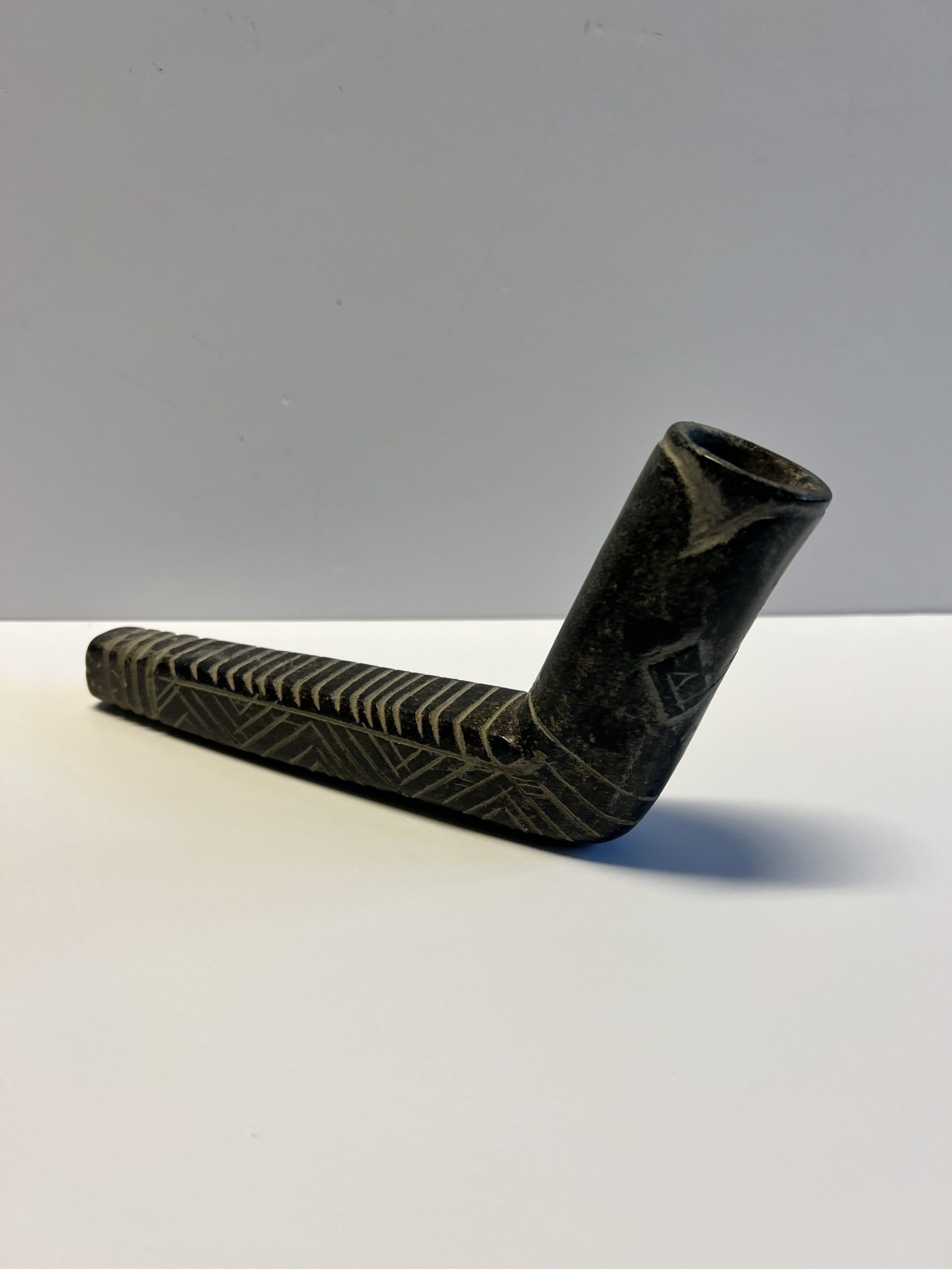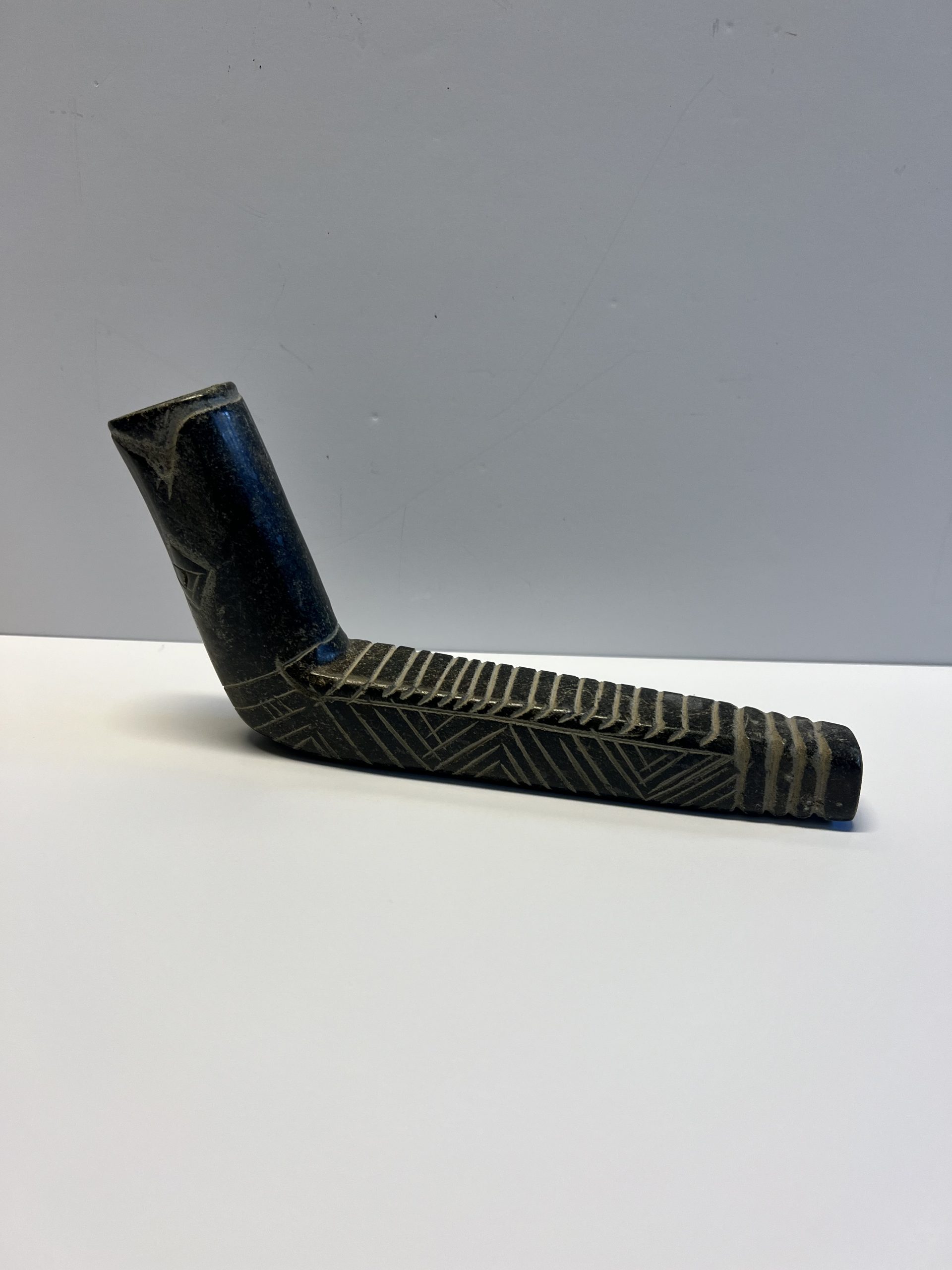 Ancient Original Native American Indian Highly Etched and Carved Stone Smoking Pipe. Measures 6 1/2″ long x 3 3/4″ tall x 1″ wide.