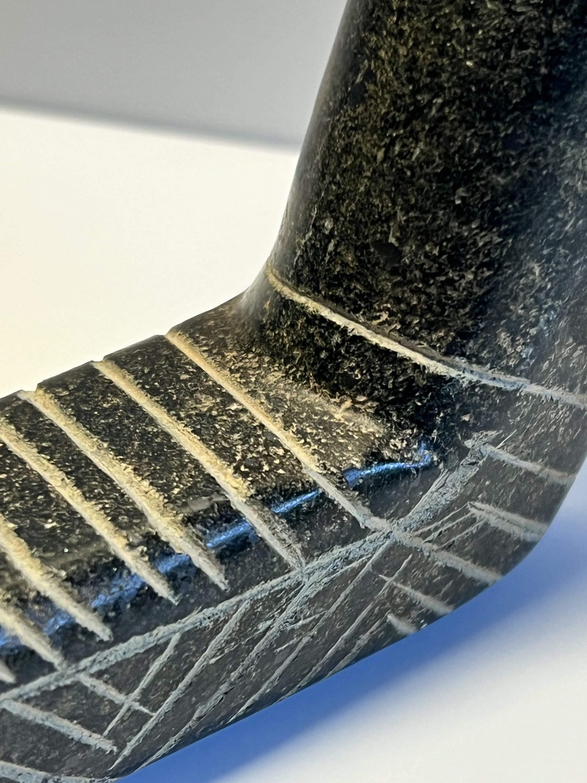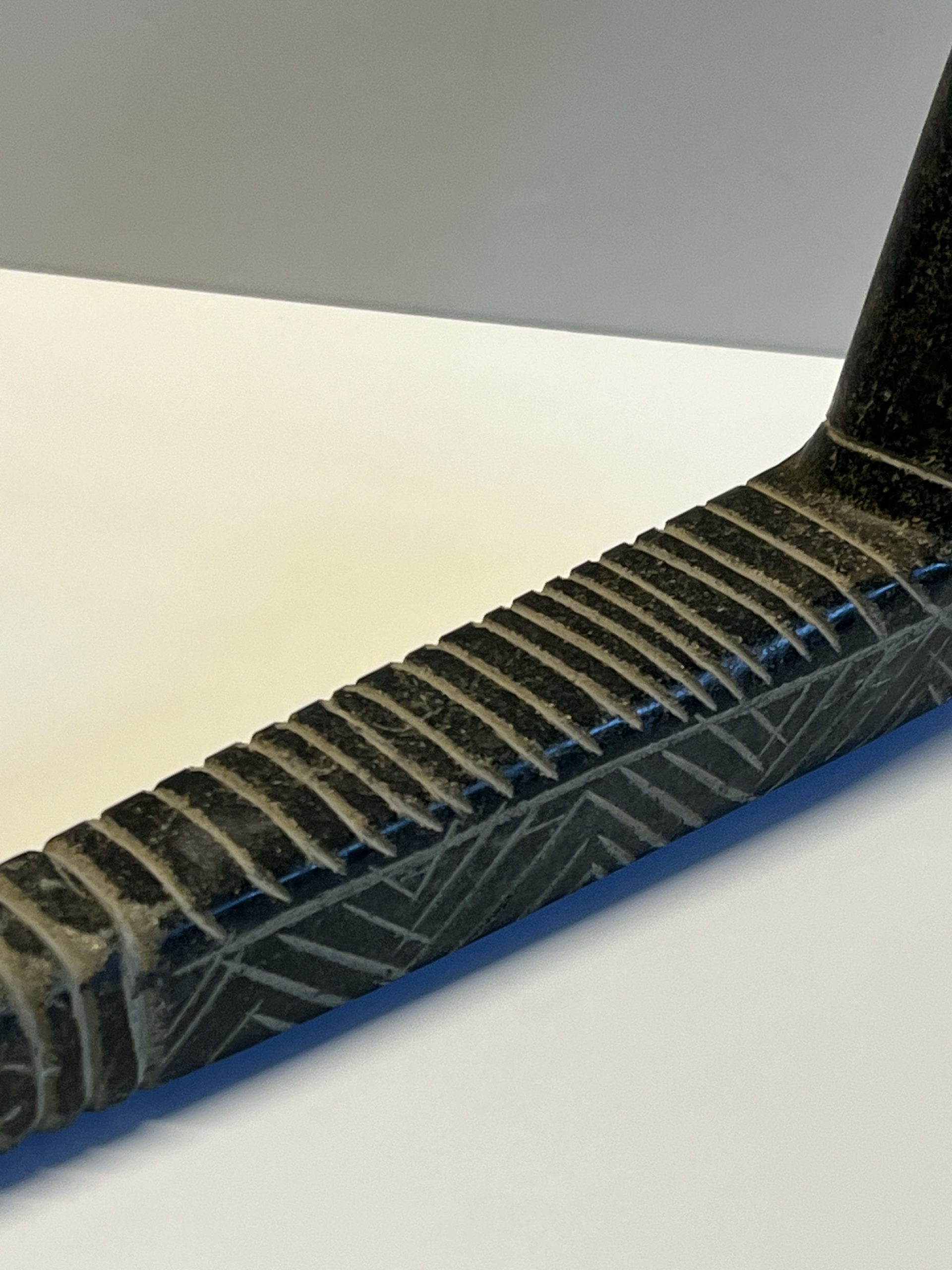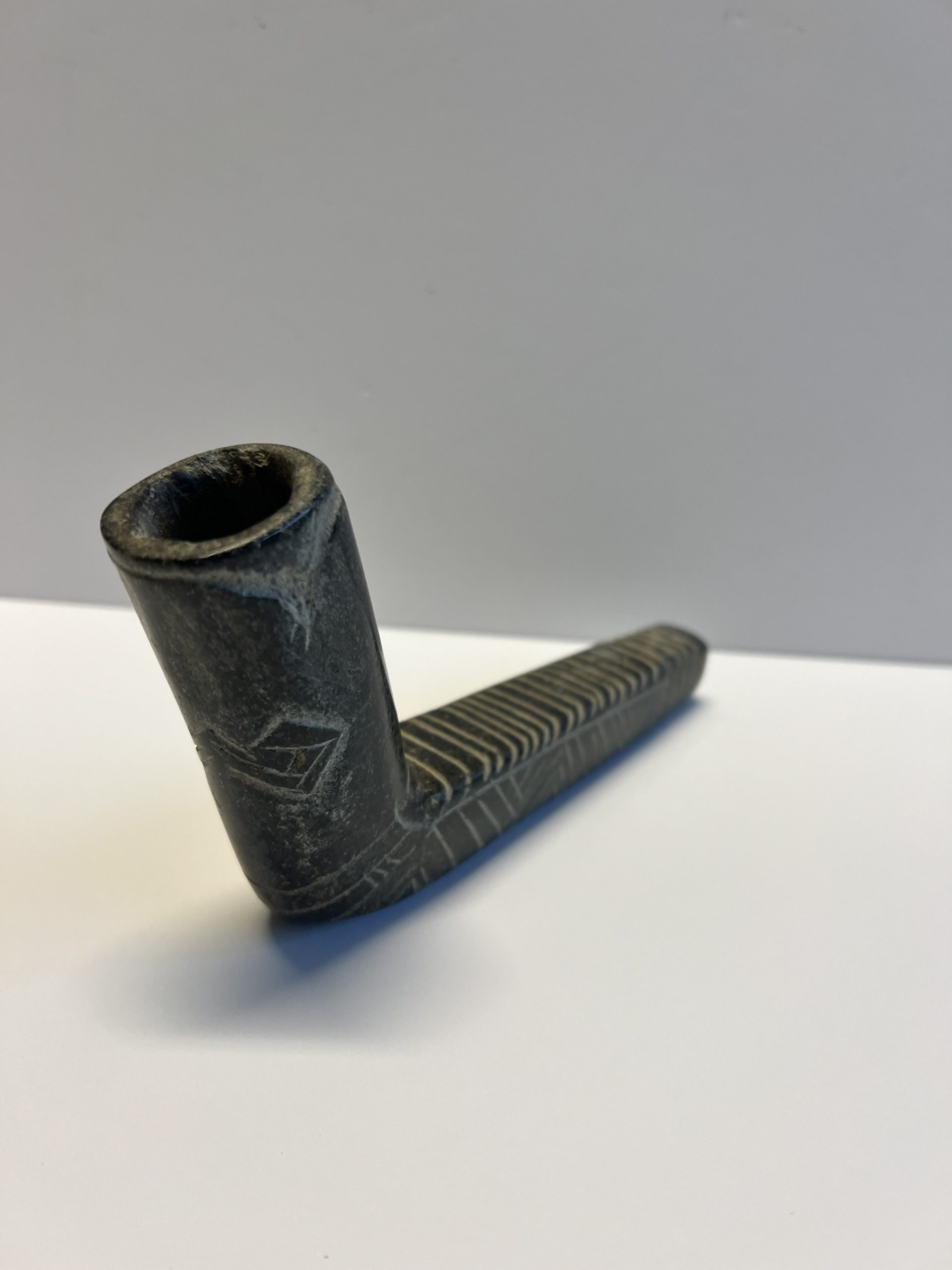 Ancient Original Native American Indian Highly Etched and Carved Stone Smoking Pipe. Measures 6 1/2″ long x 3 3/4″ tall x 1″ wide.
