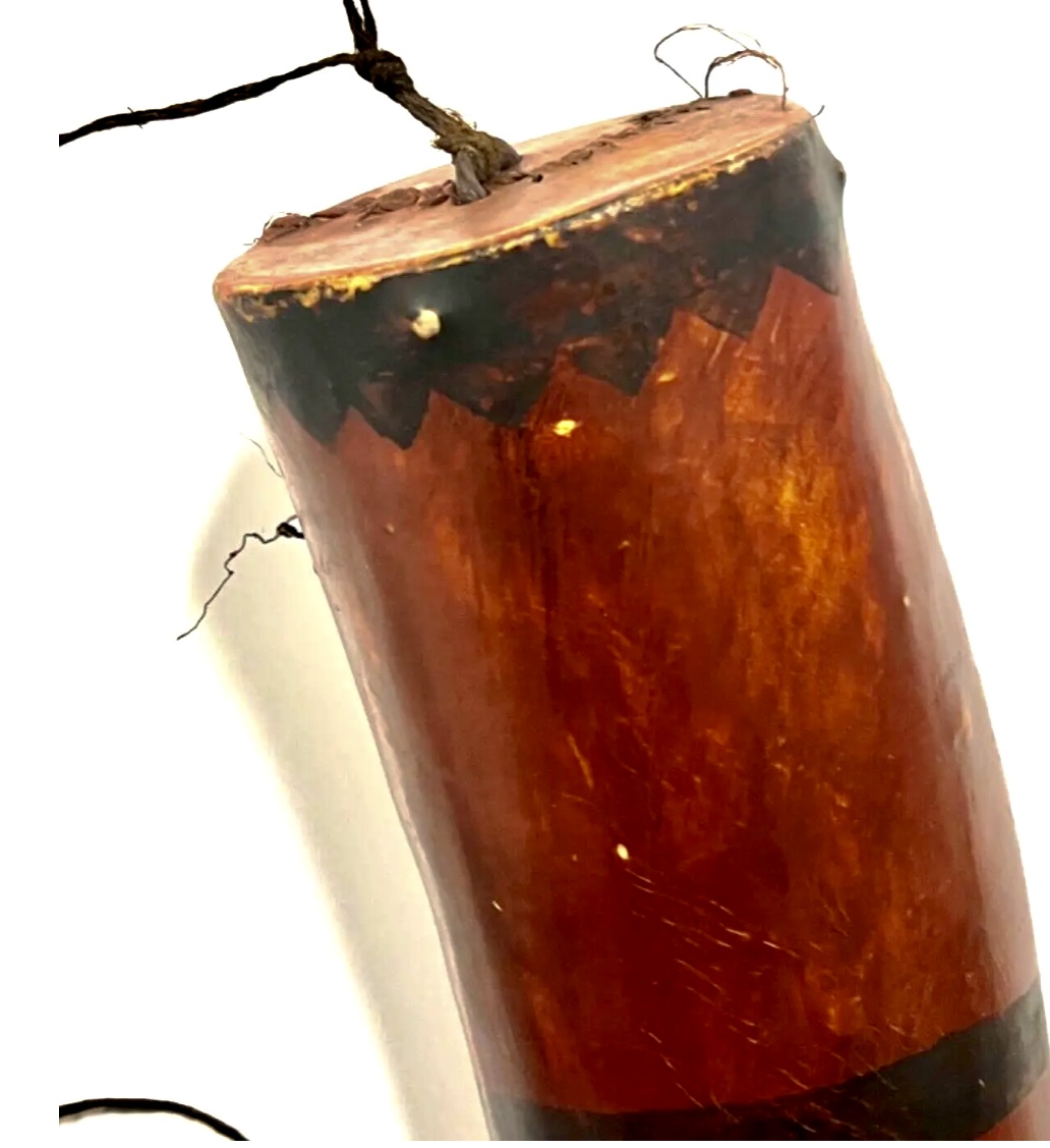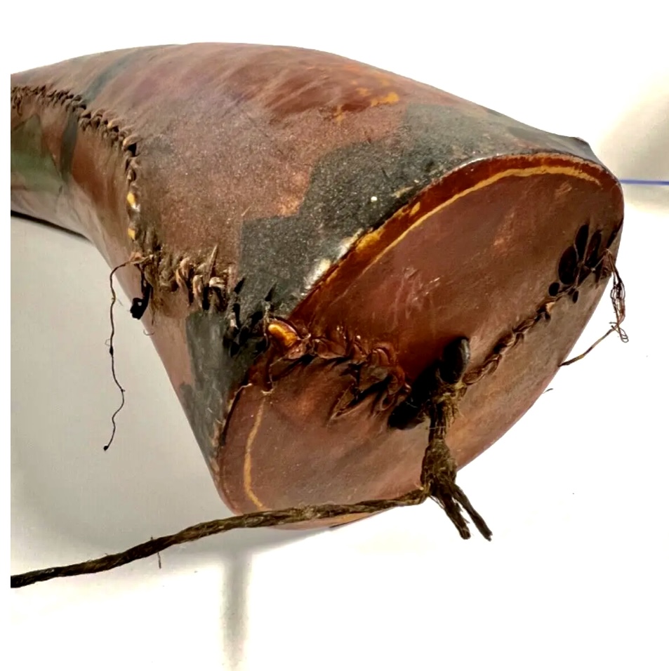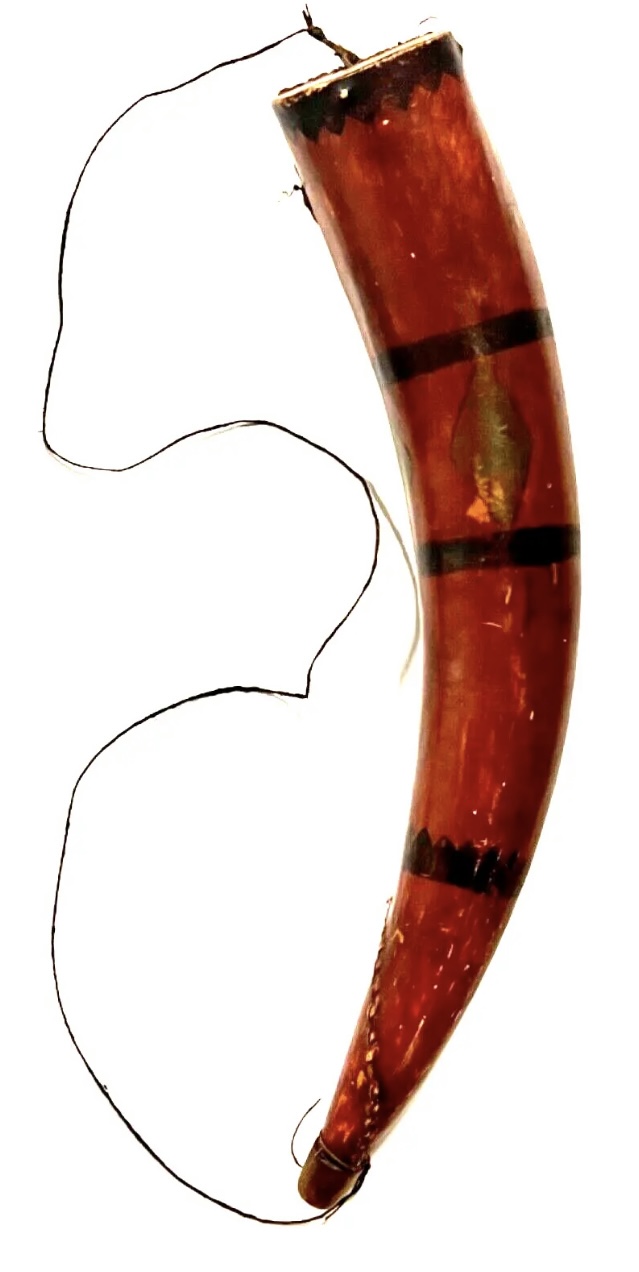 Original Antique Native American Indian Chiefs Giant Gunpowder Horn. Measures approximately 25 inches long x 4 wide with 13 inch diameter and at the bottom tip the diameter is 3 3/4 inches. A Chief had this horn filled with gunpowder and would let his warriors fill up their horns before battles or hunting. Rare. Estimate age to be 1880s to 1890s. Original paint, cap tip where they poured the gunpowder, large wide original matching butt end flat inset cover. This would have held a lot of powder. See all photos as no returns. Not a repro. You will not find another. Tremendous eye appeal for display. Muted real antique patina.