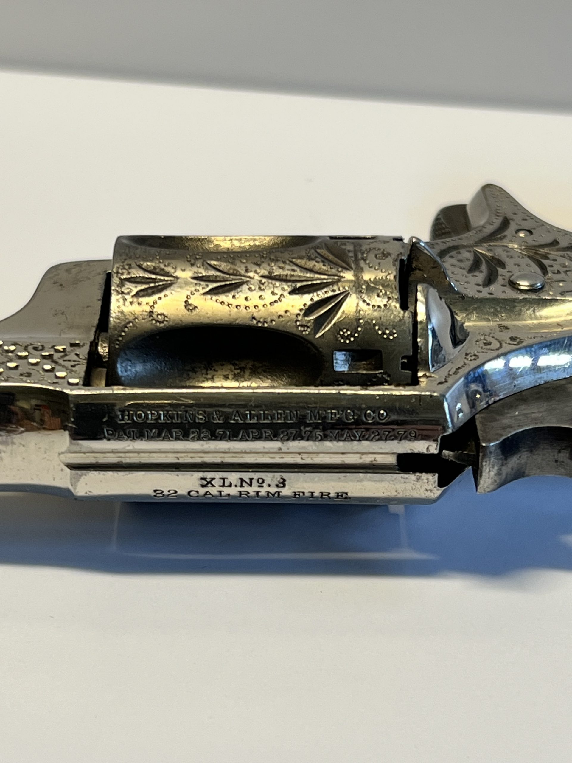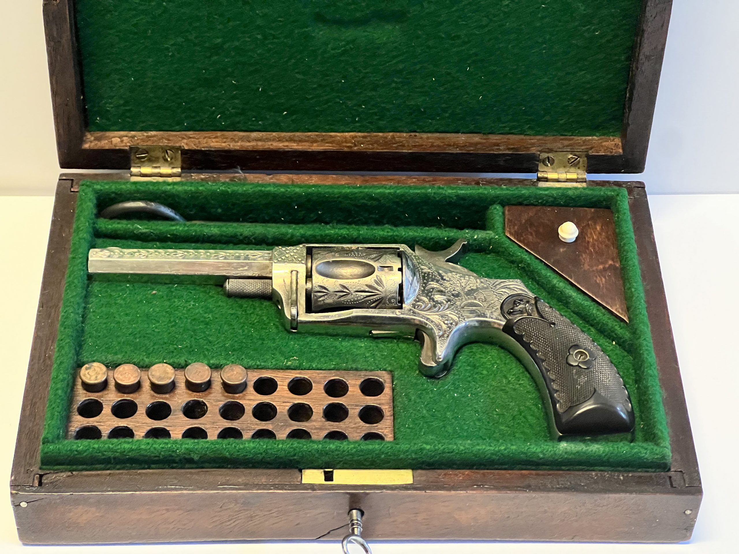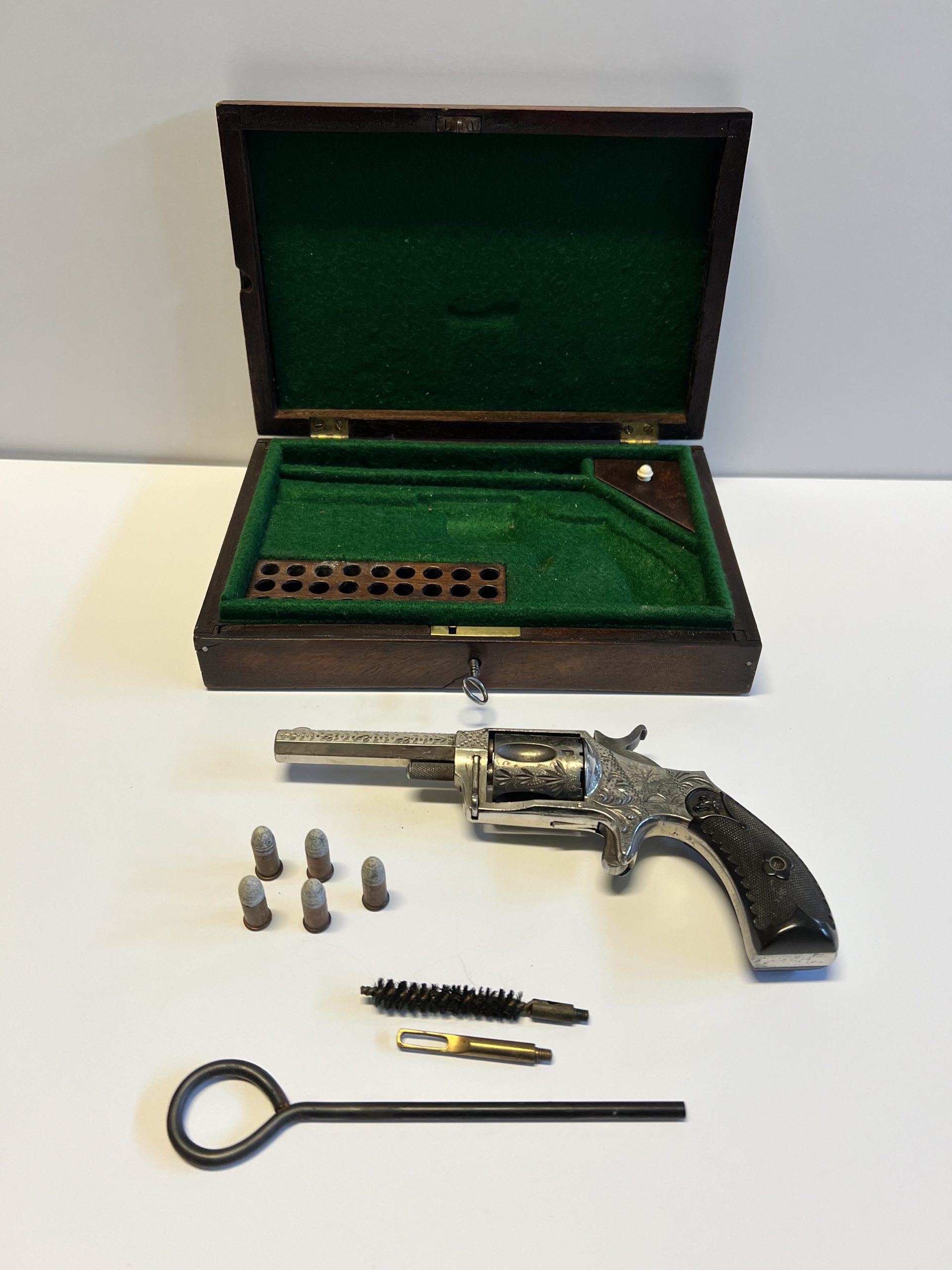 Vintage engraved and nickel plated single-action 5-shot spur triggered Hopkins & Allen Mfg Co.; 32 Caliber Rim Fire revolver with a 3″ barrel and hard rubber grips. Comes with original wood case (9″ x 6″ x 1 3/4″) and key, 5 bullets, and 3 cleaning items. See all photographs and details as No Returns. This is a vintage Hopkins & Allen Mfg Co. 32 caliber pistol made in the United States. It is a great addition for collectors of vintage gun parts and hunting enthusiasts. The pistol has a rich history and is perfect for display or as a unique item to add to your collection.