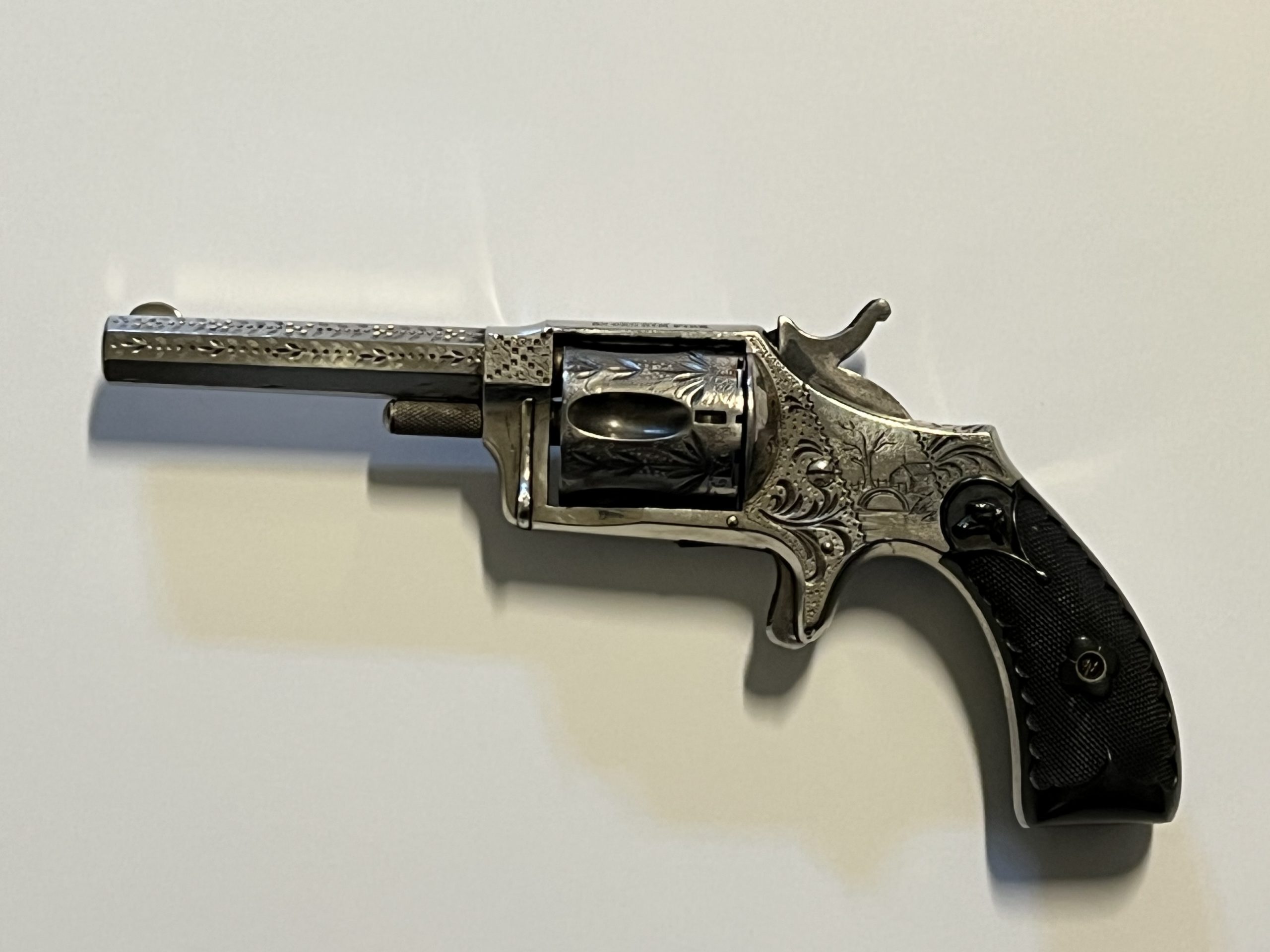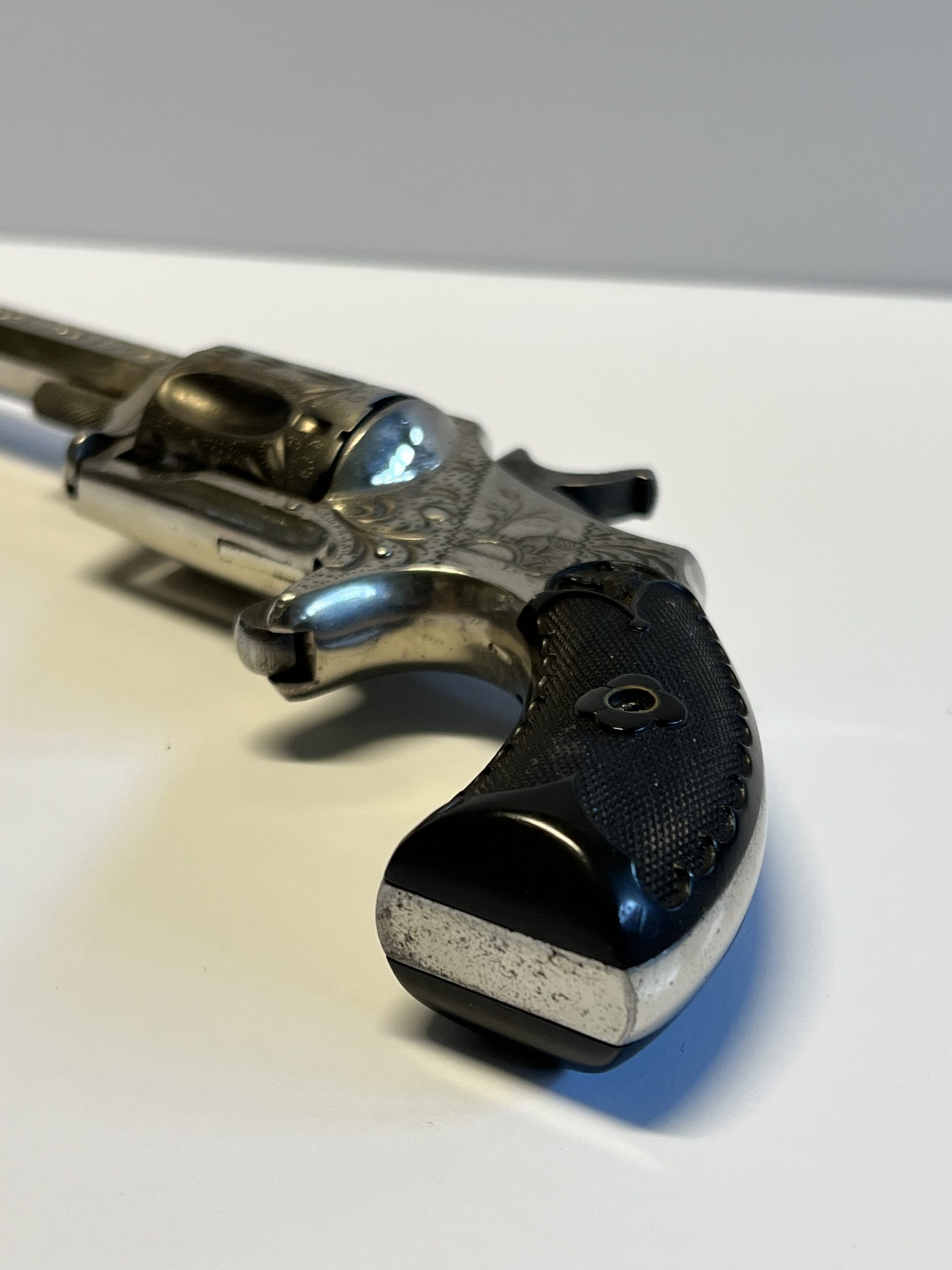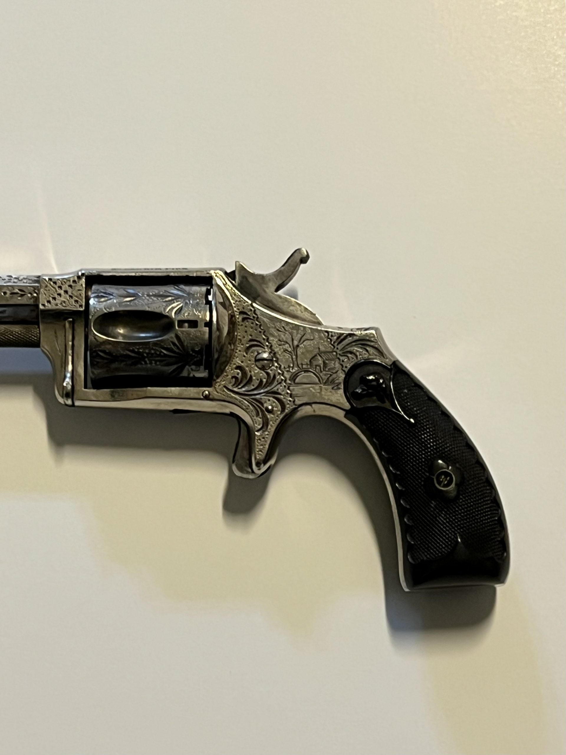 Vintage engraved and nickel plated single-action 5-shot spur triggered Hopkins & Allen Mfg Co.; 32 Caliber Rim Fire revolver with a 3″ barrel and hard rubber grips. Comes with original wood case (9″ x 6″ x 1 3/4″) and key, 5 bullets, and 3 cleaning items. See all photographs and details as No Returns. This is a vintage Hopkins & Allen Mfg Co. 32 caliber pistol made in the United States. It is a great addition for collectors of vintage gun parts and hunting enthusiasts. The pistol has a rich history and is perfect for display or as a unique item to add to your collection.